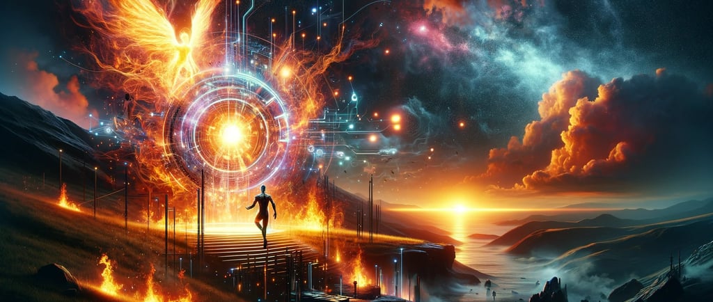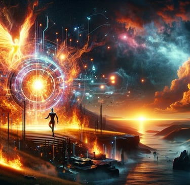 Dive into the striking visual narrative of 'The Baptism of Fire: Man Meets AI', an image that encapsulates the essence of our latest blog's exploration into Period 9's transformative impact. Just as fire represents the technological revolution, the luminous horizon echoes our collective awakening in this era of profound change. This landscape is more than a visual feast; it's a reflection of the themes discussed in our in-depth blog post on the convergence of human consciousness with artificial intelligence. Join us on this journey of discovery and read more about how these powerful forces are shaping our present and future.