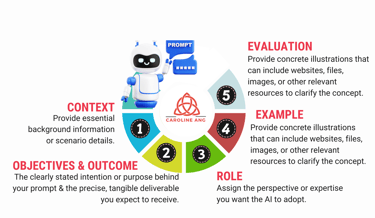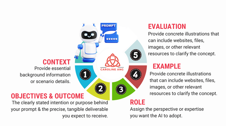 Context, Objective, Role, Example, and Evaluation.
